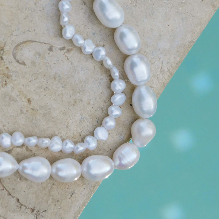 Freshwater Pearls – timeless and also very hot right now. Freshwater Pearl collection. The ‘new preppy’ is a big trend, and these items are perfect to complete the look – for party and everyday. The collection has a whole range of styles to choose from – just pick your favourites. Plated with real gold.