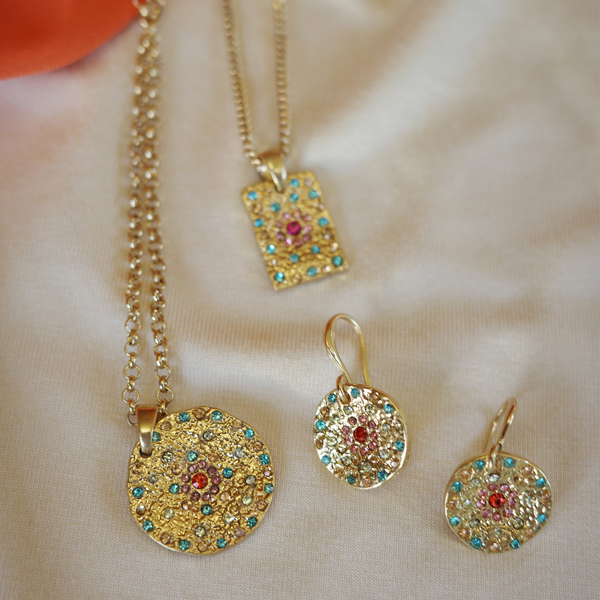 Vibrance is a beautiful, colourful collection adding that perfect touch to your summer outfit. The collection is based on textured coins adorned with sparkling, colourful stones. Here you can choose single pendants which are perfect for layering. Or if you prefer a bolder look, choose pieces with charms – one of this season’s major trends. Plated with real gold and real silver.